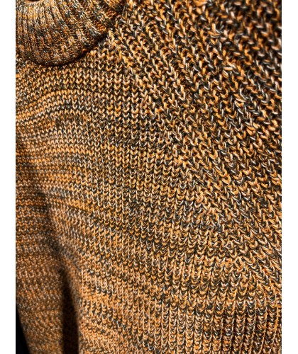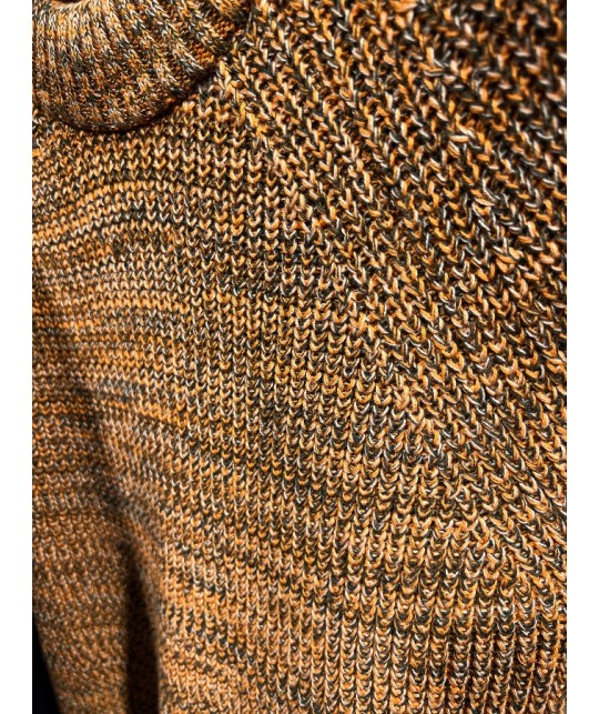 Pull en coton bio mouliné, mélange de fils vert, blanc cassé et orange (twisted yarn).