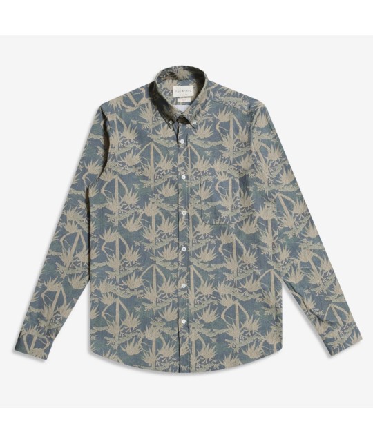 Chemise en seersucker imprimé intégral bambou sur fond bleu délavé.