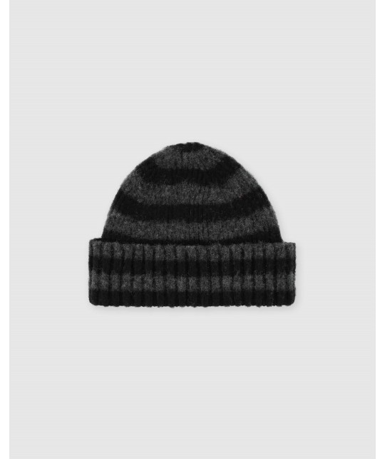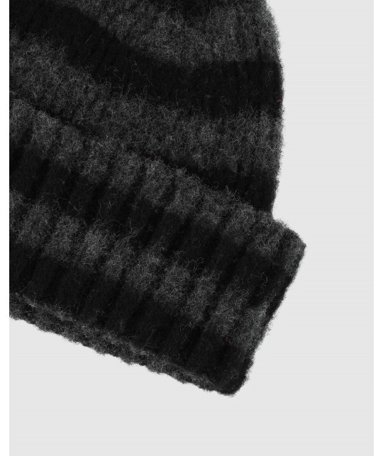 Two-tone charcoal and black striped Shetland wool hat with ribbed cuff. 100% pure Scottish virgin wool. Made in Scotland. One size fits all.