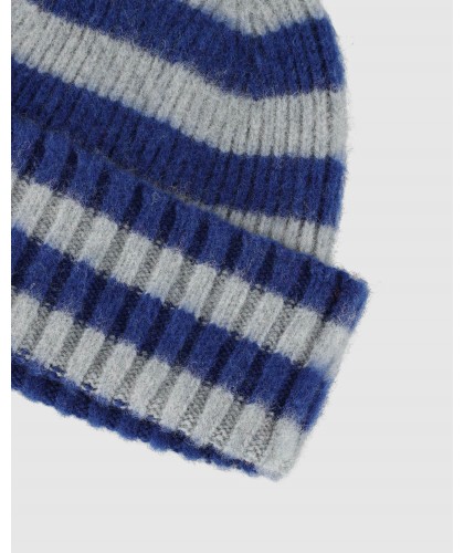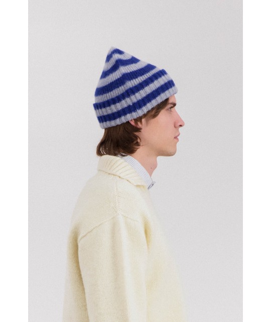 Two-tone light gray and blue striped Shetland wool hat with ribbed cuff. 100% pure Scottish virgin wool. Made in Scotland. One size fits all.