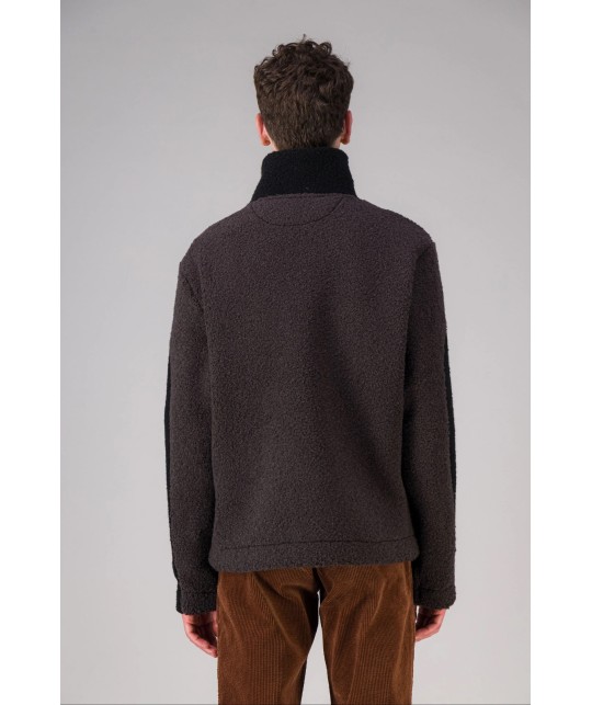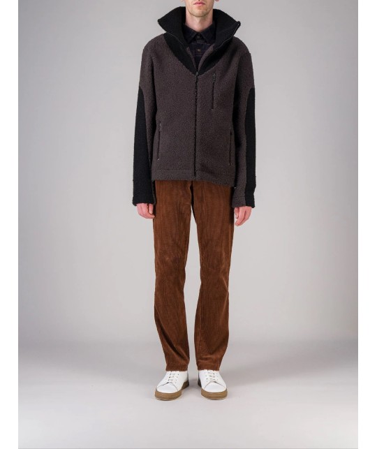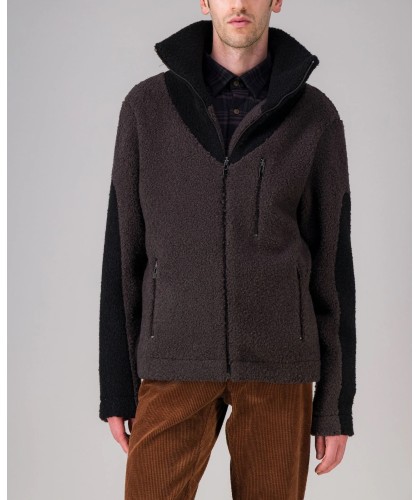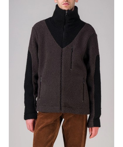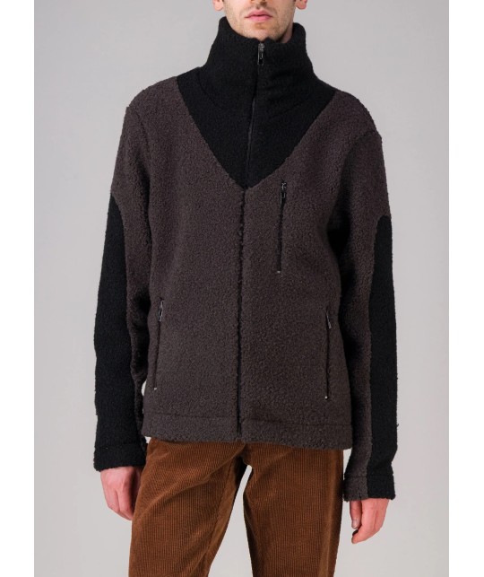 Brown and black wool fleece zipped jacket, stand-up collar, 3 zipped pockets. 85% wool, 15% polyester. Made in Portugal.