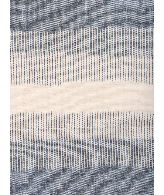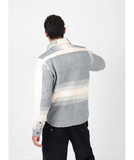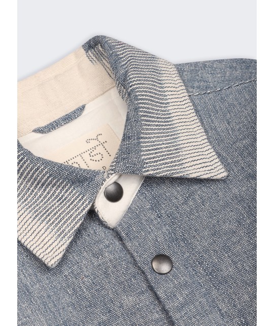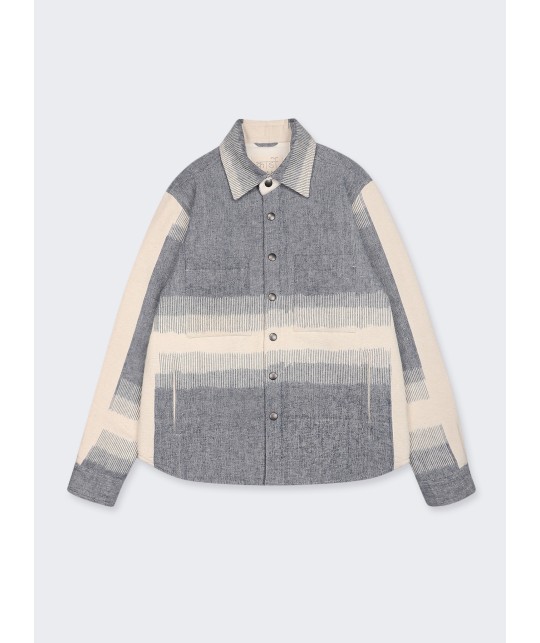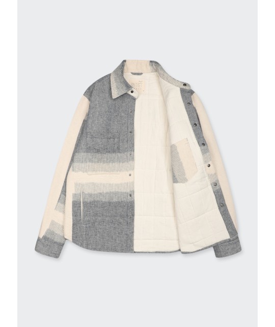 Padded jacket with snaps, made from artisanal ikat fabric in ecru and denim blue. 2 side pockets, 1 inside pocket.