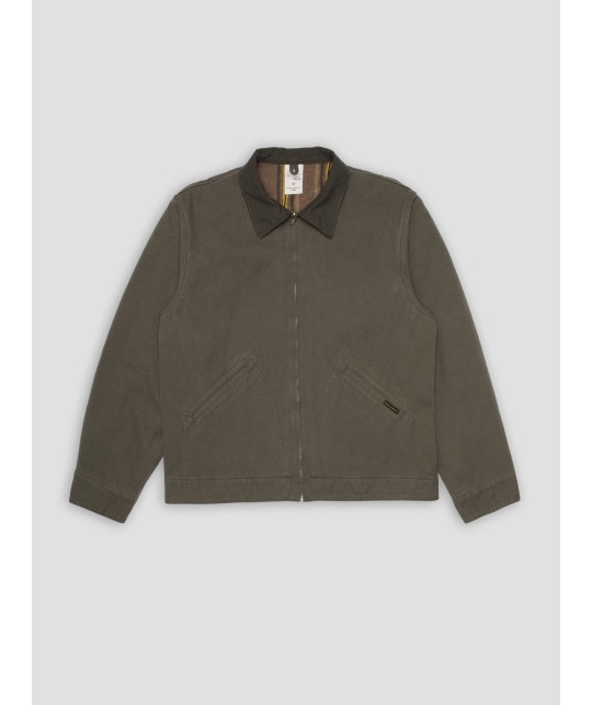 Grey green duck canvas jacket with zipper closure, velvet collar, and brown flannel lining. 2 side pockets, 1 inside pocket. 100% organic cotton, vegan, ethically made in Tunisia.