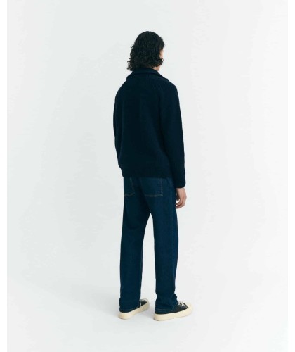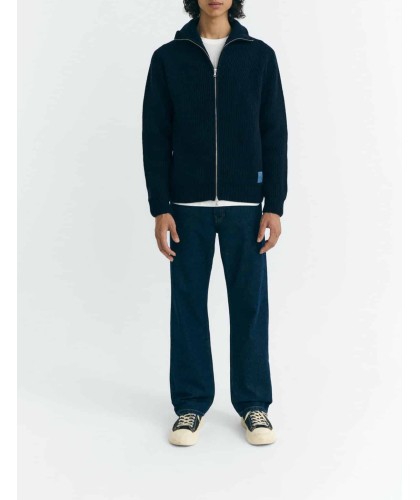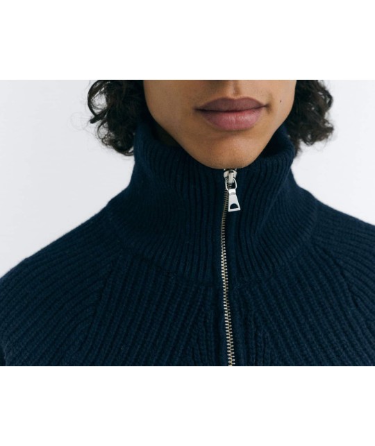 Navy ribbed wool cardigan with full zip and high collar. 100% extra-fine wool. Made in Spain.