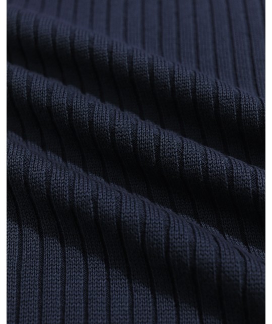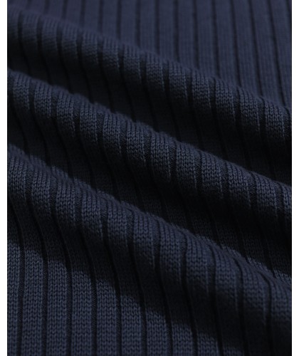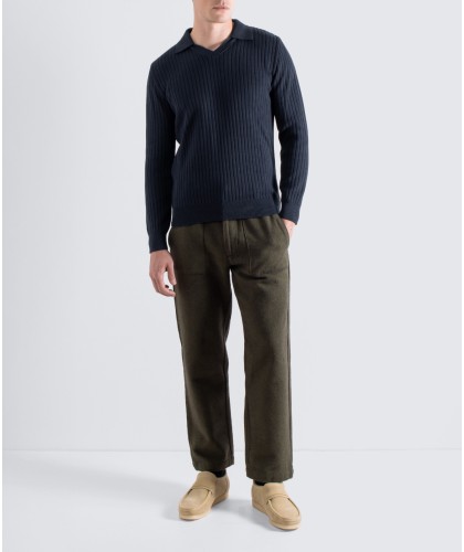 Navy cotton polo sweater with textured stripes and open collar. 100% organic cotton, ethically made in Turkey. Vegan.