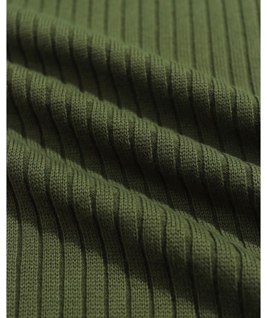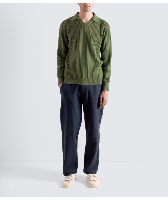 Green cotton polo sweater with textured stripes and open collar. 100% organic cotton, ethically made in Turkey. Vegan.