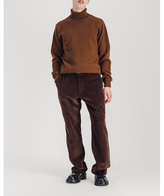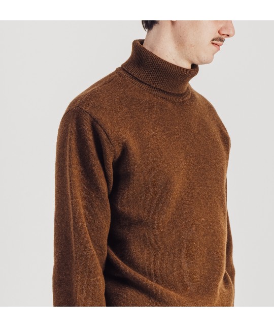 Rust-colored wool turtleneck sweater. Ribbed collar, cuffs, and waistband. 100% wool, made in Portugal.