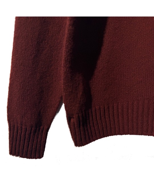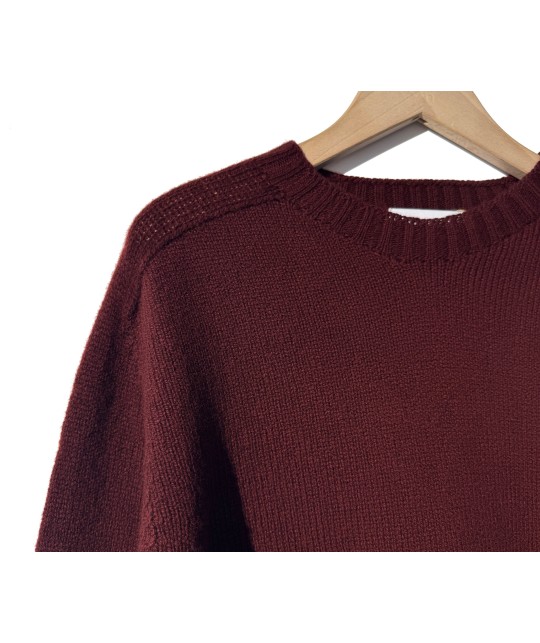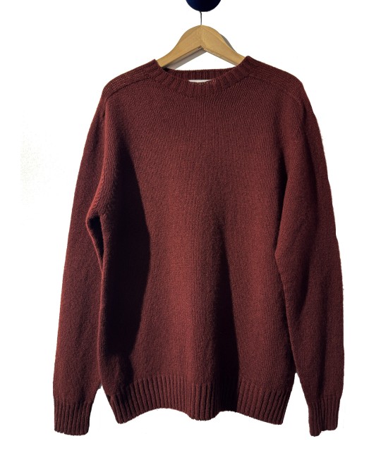 Burgundycrewneck sweater in lambswool, ribbed collar, cuffs, and waistband. 100% lambswool, made in the United Kingdom.