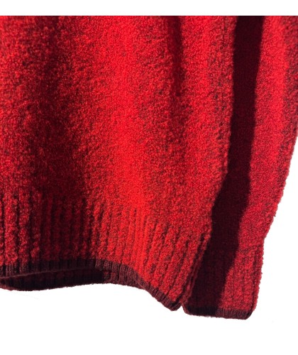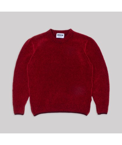 Bright red fleece-textured crew neck sweater with burgundy mix, ribbed collar, waistband, and cuffs. 54% lambswool, 35% merino, 10% polyester, 1% elastane. Made in the UK.