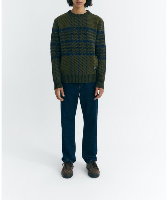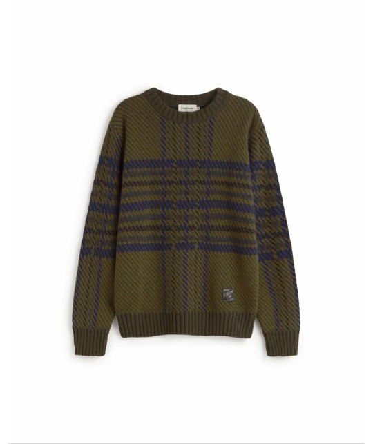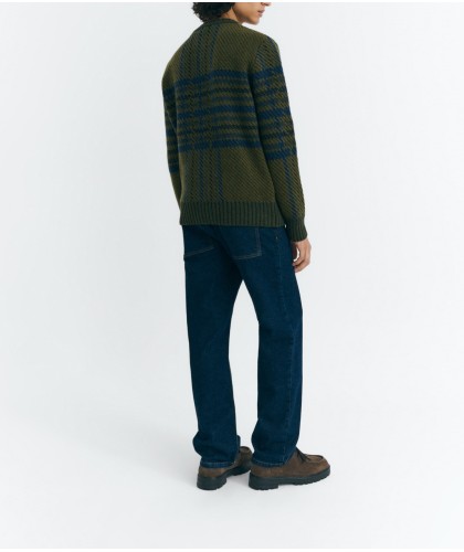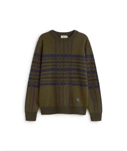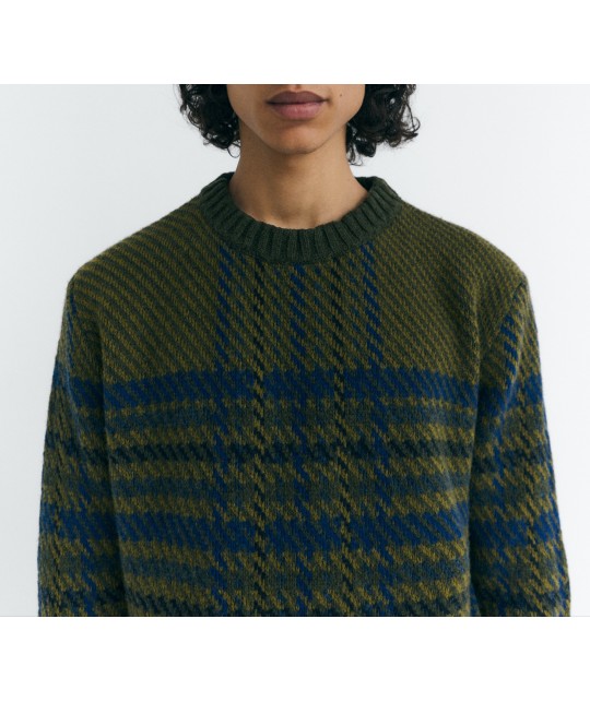 Green wool sweater with large black and blue checks. 100% wool, made in Spain.
