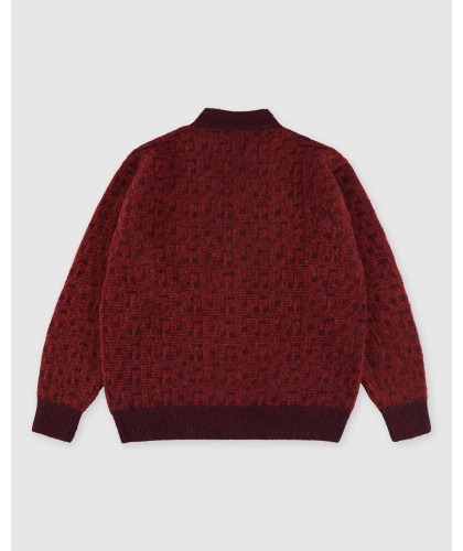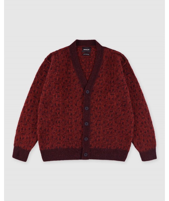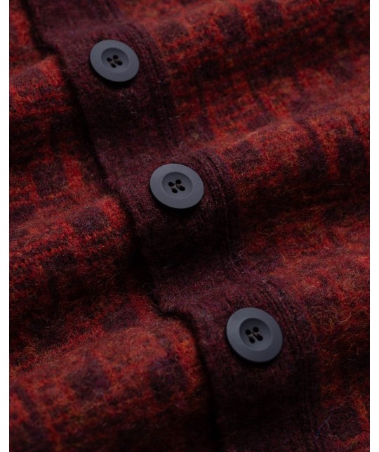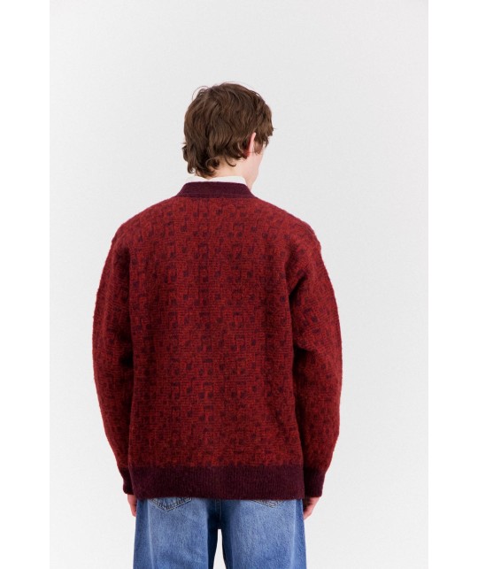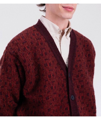Thick, warm wool cardigan with subtle musical note pattern, red and burgundy. 5 buttons. 100% brushed Scottish virgin wool, made in Scotland.
