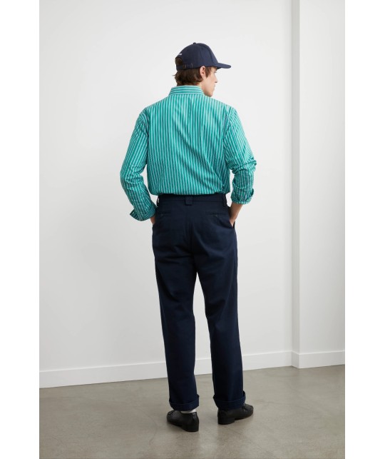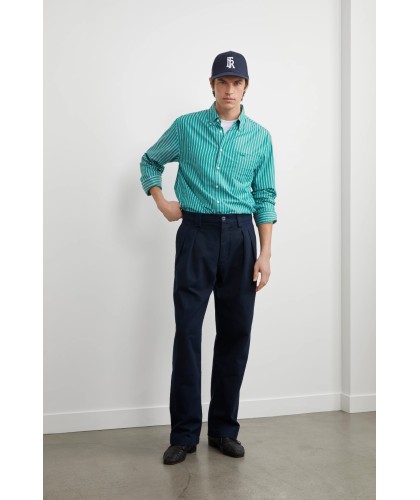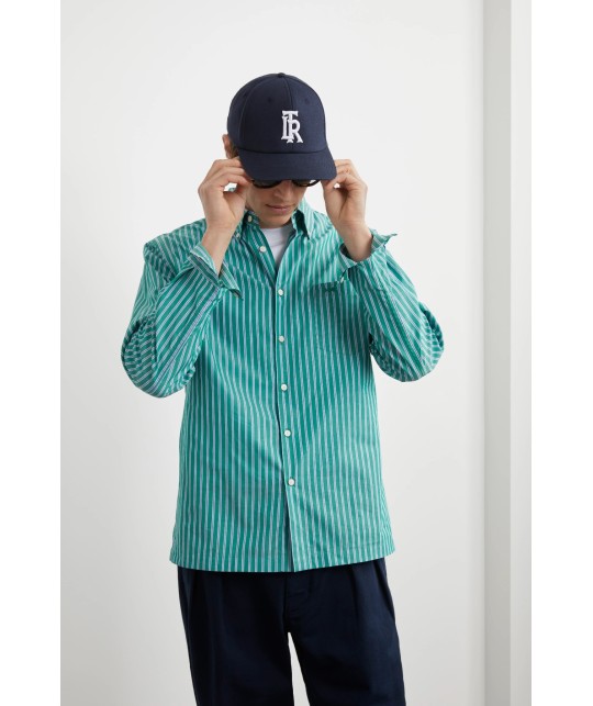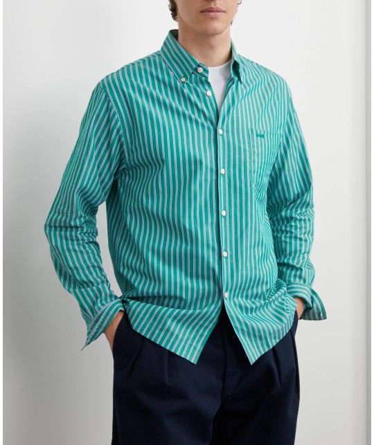 Lightweight green poplin shirt with blue and white stripes. Button-down collar, 1 discreetly embroidered breast pocket.