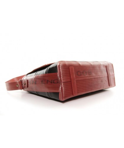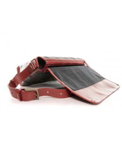 Shoulder bag made from upcycled materials: leather offcuts from Burberry and a fire hose from the British fire service.