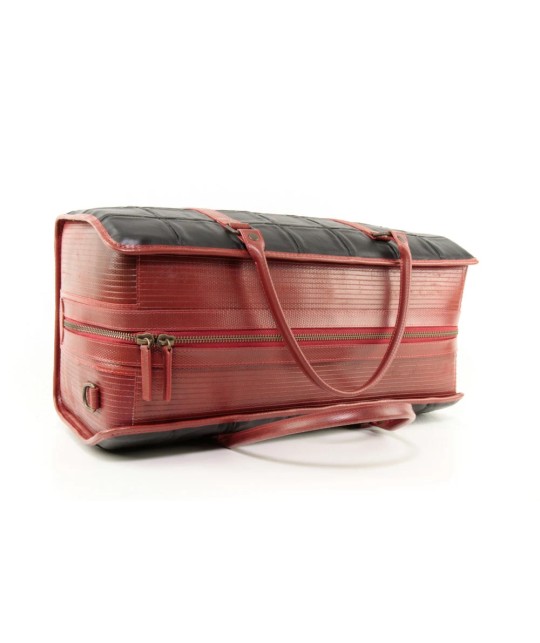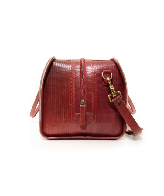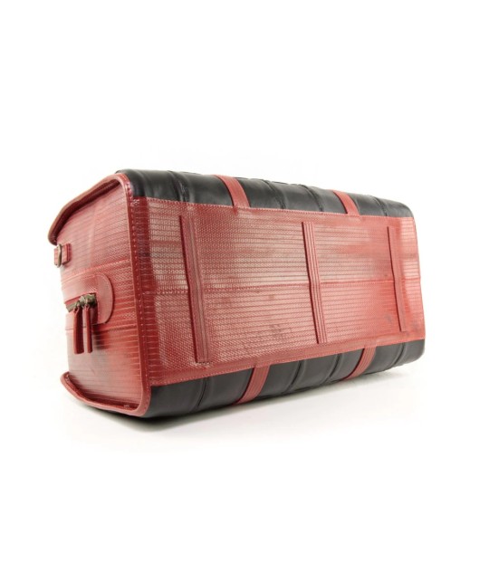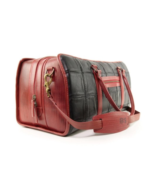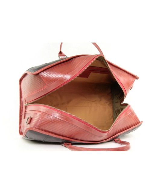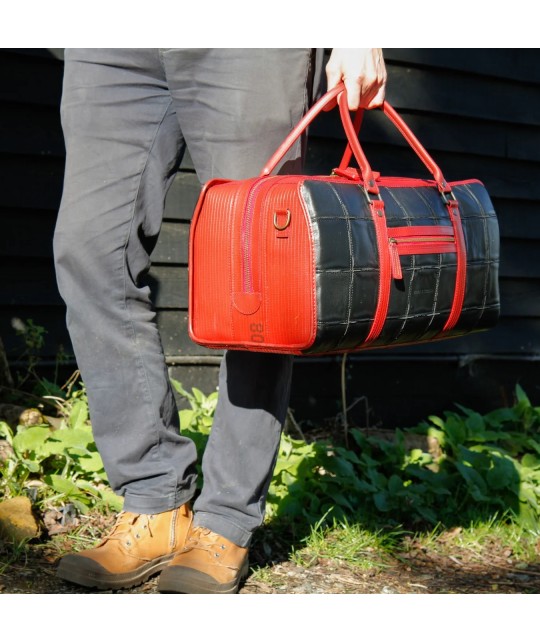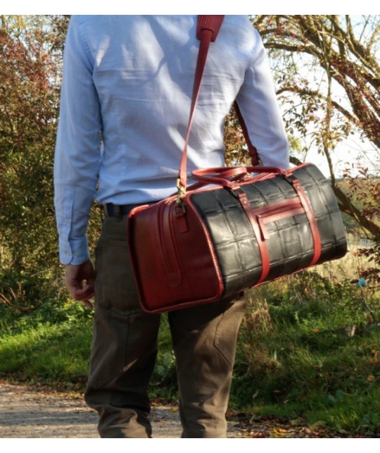 Travel bag made from upcycled Burberry leather scraps and fire hose.