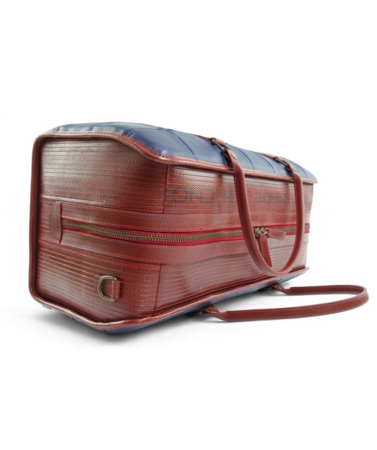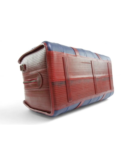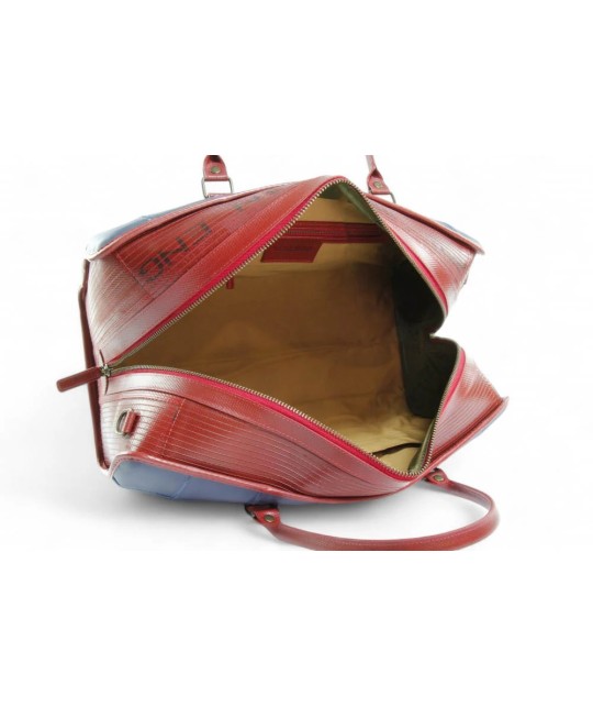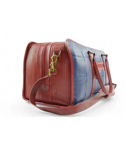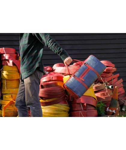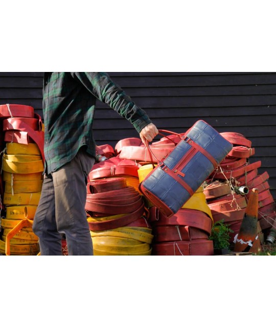 Travel bag made from upcycled Burberry leather scraps and fire hose.