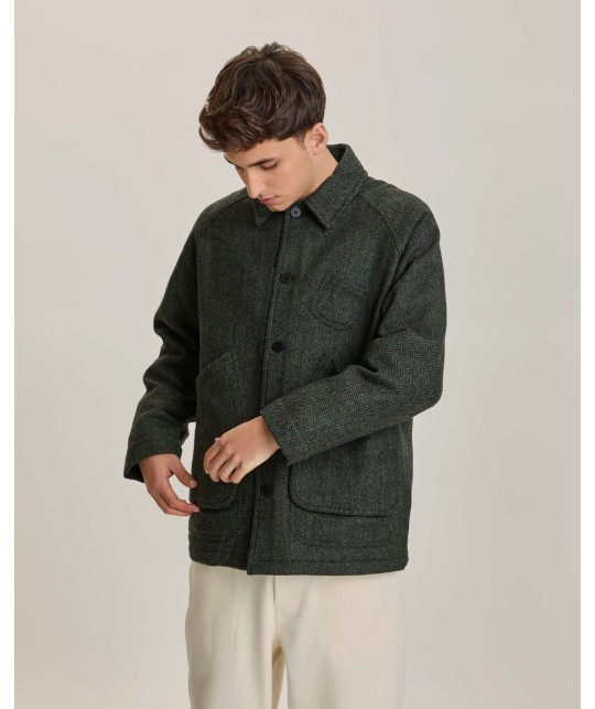 Veste en laine épaisse vert foncé à chevrons noirs, doublure coton matelassée, manches raglan, coupe oversize.