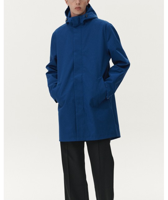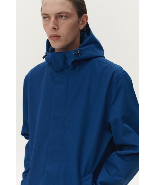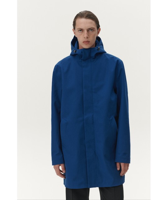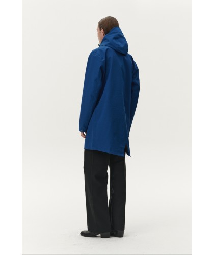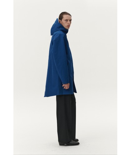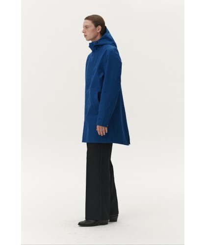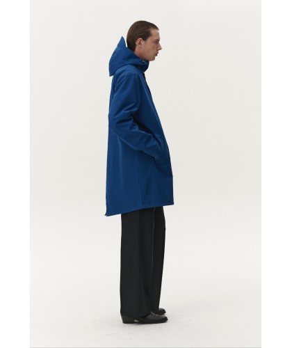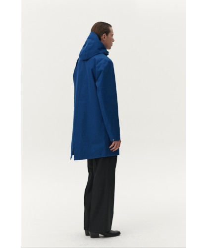 Cobalt blue fishtail waterproof coat with hood. 2 way zipper + snaps, ideal for mid-season rain.