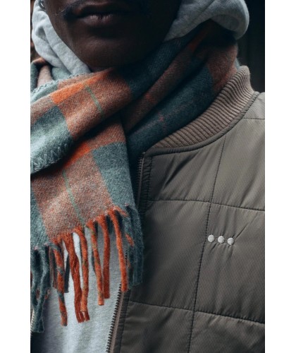 Echarpe en laine recyclée, motif tartan vert et orange pâles.