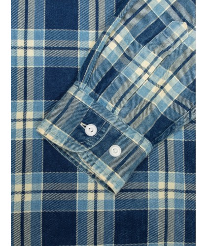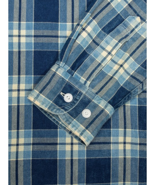 A soft cotton checked shirt in various shades of blue, including indigo. Two chest pockets, corozo buttons.