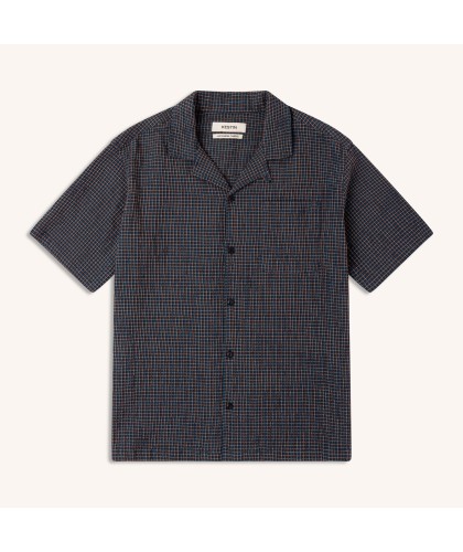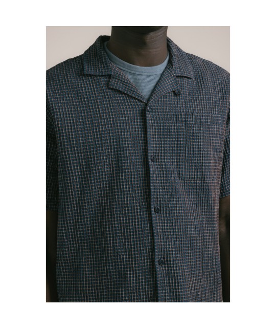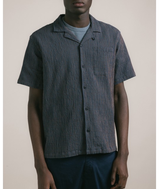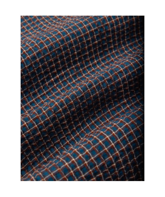 Textured cotton shirt with a navy blue, red and ecru checked pattern. Japanese fabric