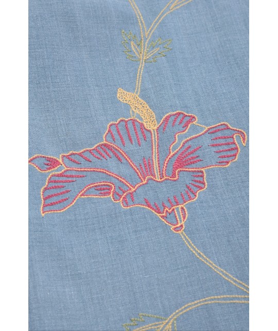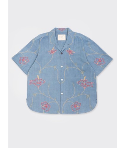 Khadi cotton shirt, naturally indigo-dyed, with a hand-embroidered floral pattern. Oversized fit, open neckline. 100% organic cotton, vegan, made in India.