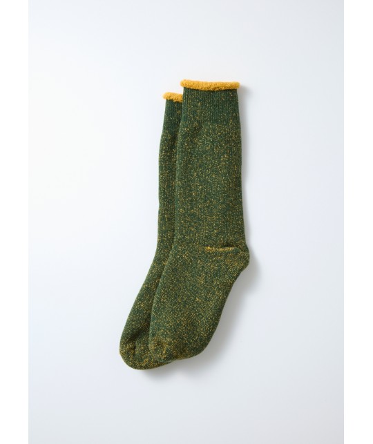 Double-sided socks, green exterior, thick yellow pile interior. 90% cotton, 9% polyester, 1% polyurethane. Made in Japan.
