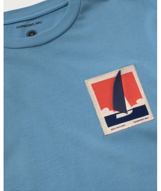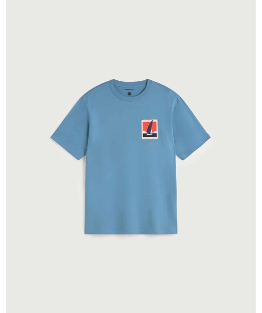 T-shirt en coton bio bleu, patch à motif Optimist sur la poitrine.