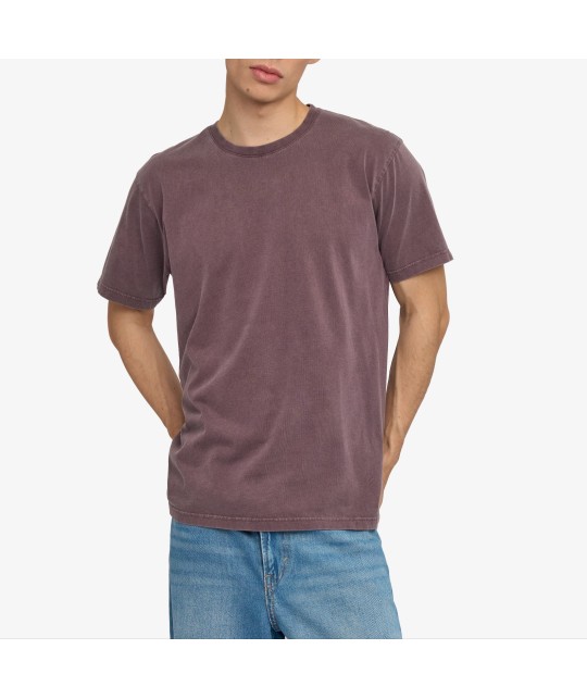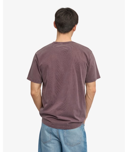 Garment-dyed, faded burgundy organic cotton T-shirt, pre-washed to prevent shrinkage, anti-pilling, 180g fabric. 100% GOTS-certified organic cotton, made in Portugal