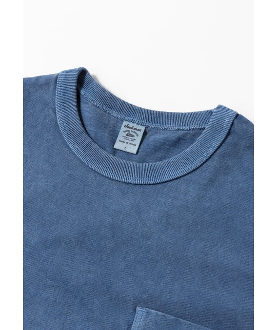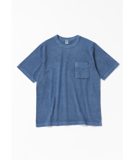 Faded indigo tee with a chest pocket, made from thick Japanese-weaved cotton.