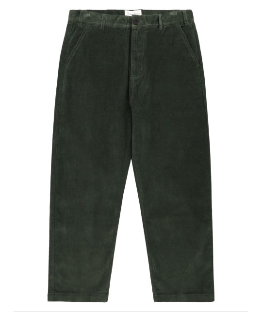 Pine green corduroy pants, wide straight leg. 98% organic cotton, 2% elastane. Ethically made in India.