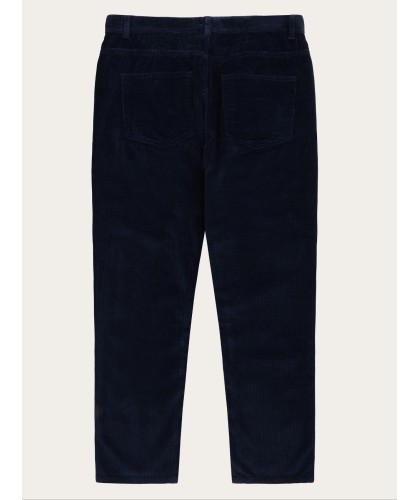 5-pocket pants in midnight blue checkered cord. 98% organic cotton, 2% elastane. Ethically made in India.