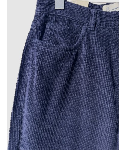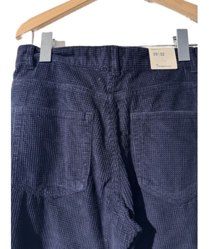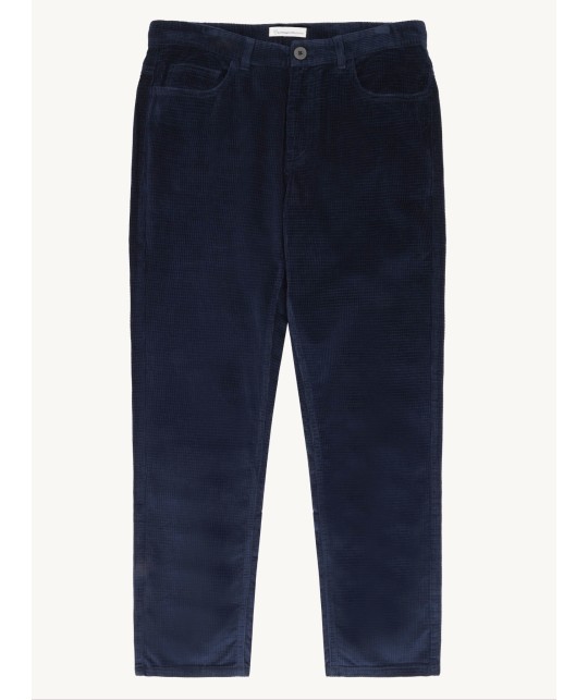 5-pocket pants in midnight blue checkered cord. 98% organic cotton, 2% elastane. Ethically made in India.