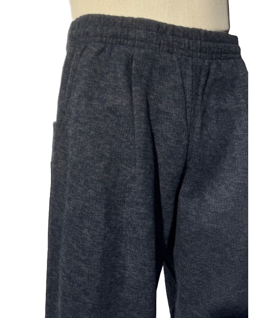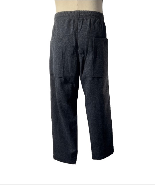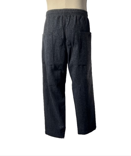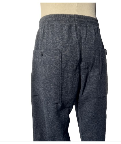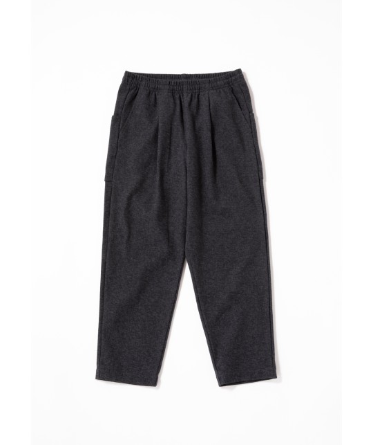 Black tweed pants, loose fit with pleats, elastic waistband, 2 back patch pockets with buttons. No fly. 100% cotton - made in Japan