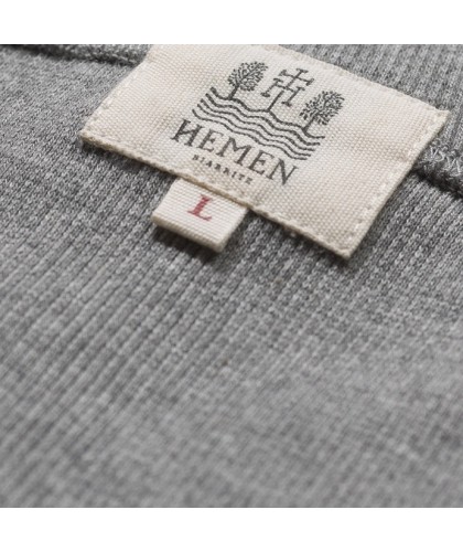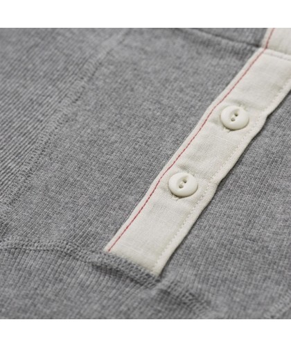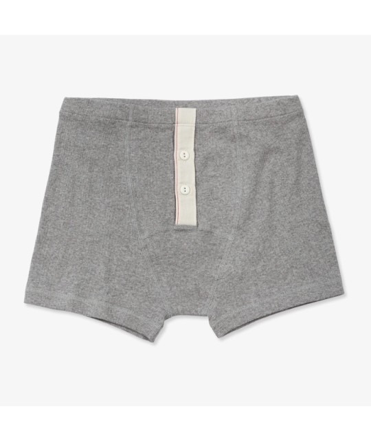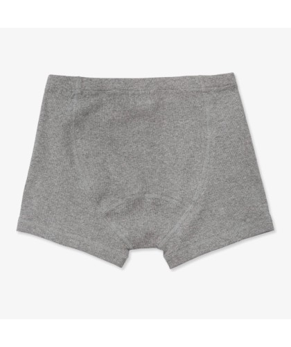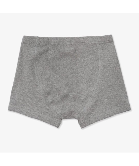 Heather grey riped boxer shorts in finely ribbed organic cotton jersey, with a narrow elasticated waistband, an off-white button placket made from a cotton-linen blend, featuring two buttons, and red topstitching. 96% GOTS-certified organic cotton, 4% elastane, made in Portugal.