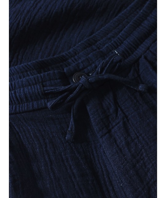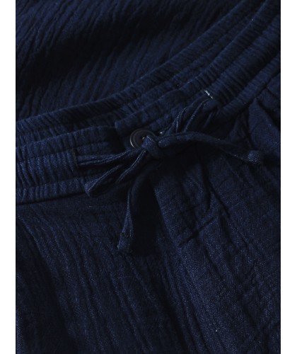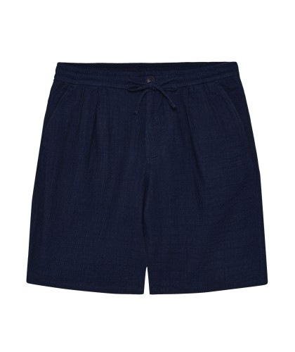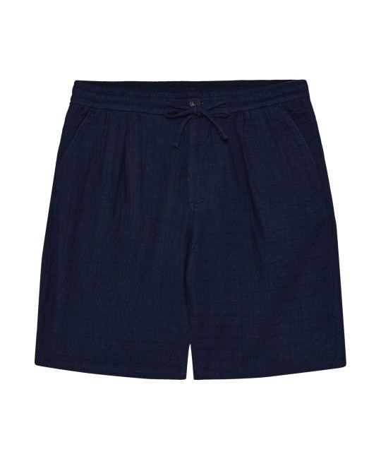 Short en gaze de coton légère, teint à l'indigo. Taille élastiquée et cordon de serrage, 1 bouton, fermeture éclair, poches latérales, 2 poches arrières passepoilées.