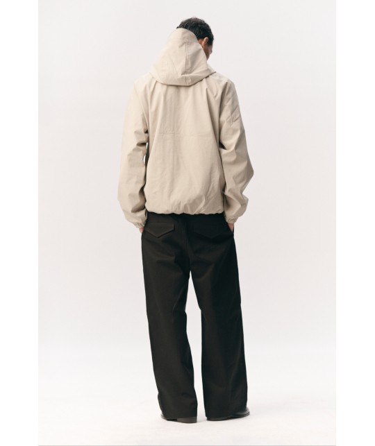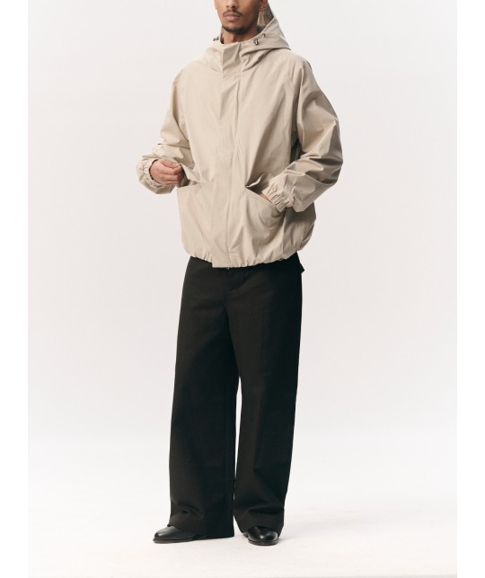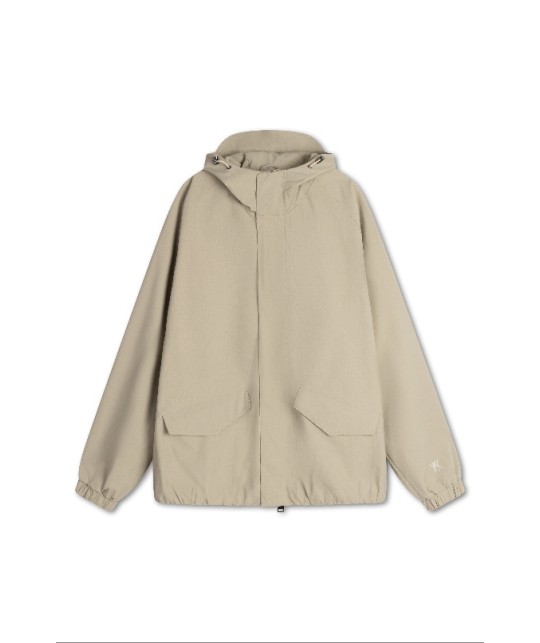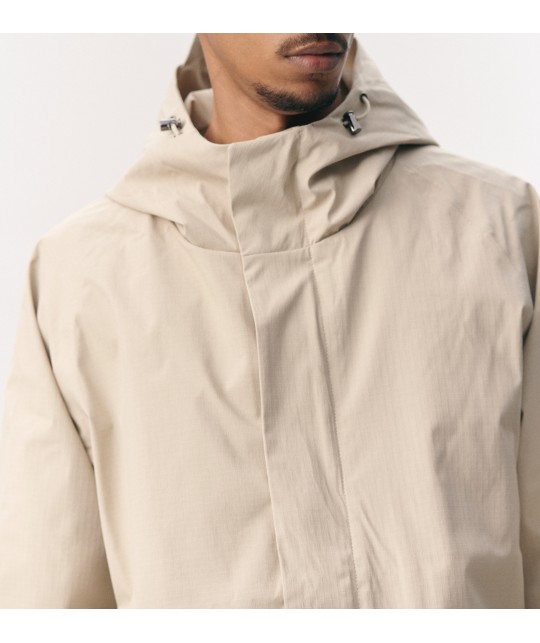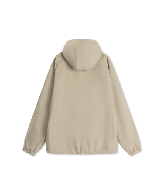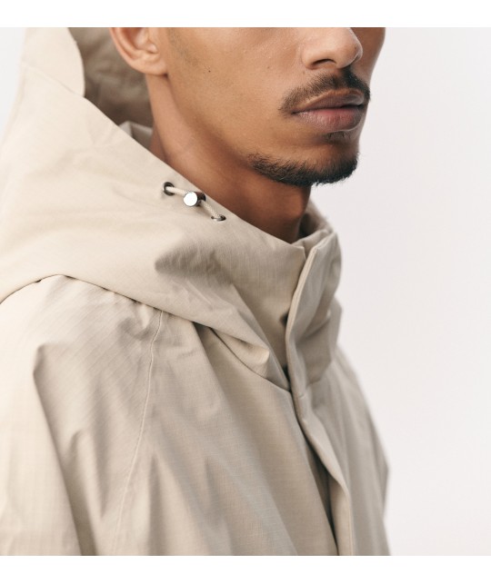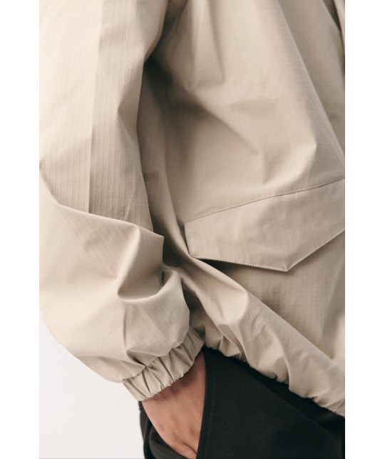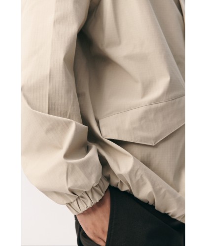 Blouson imperméable en ripstop beige. Poches latérales à rabats aimantés. Fermeture éclair + aimants. Coutures étanches. Taille et poignets élastiqués. Manches raglan.