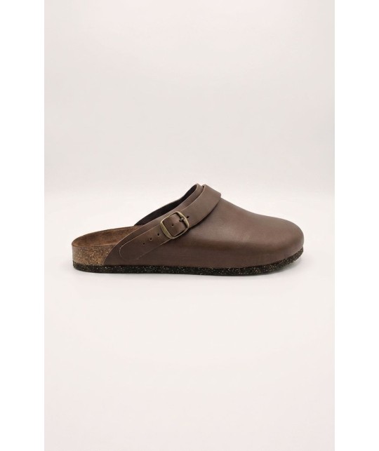Mules en cuir de vachette marron, semelle en liège intérieur cuir, bride réglable pivotante.