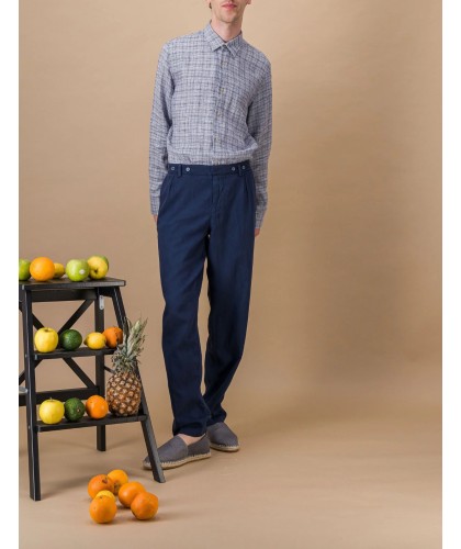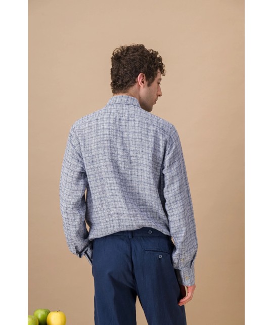 Chemise en lin bleu chiné à discrets carreaux, col à boutons cachés, boutons en corozo.