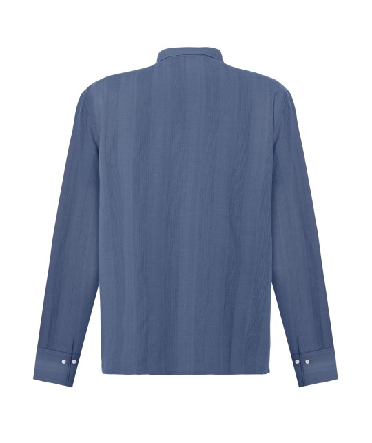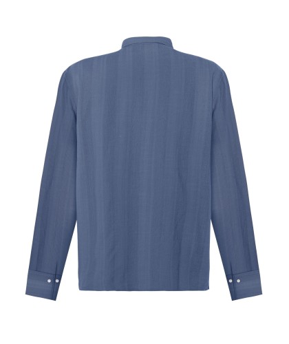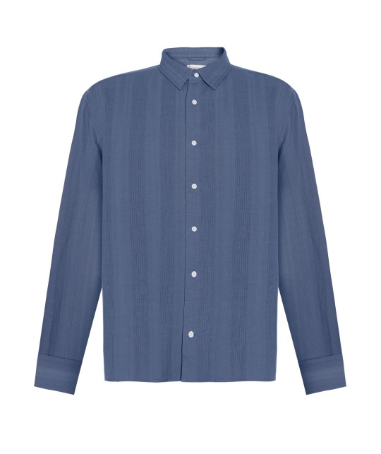 Chemise en coton bio bleu indigo délavé à rayutres texturées.