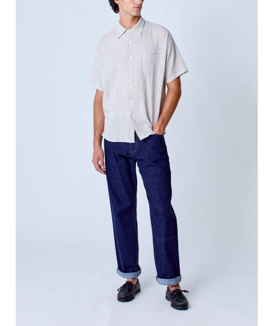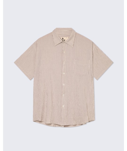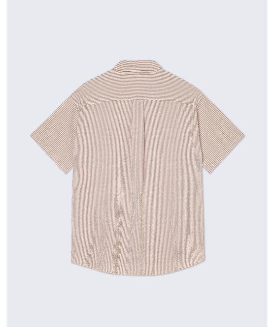 Chemise ample en seersucker à fines rayures marron. 1 poche poitrine.