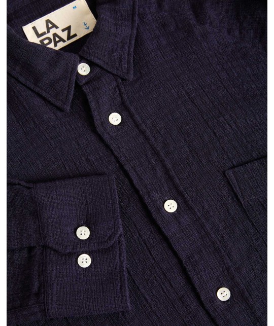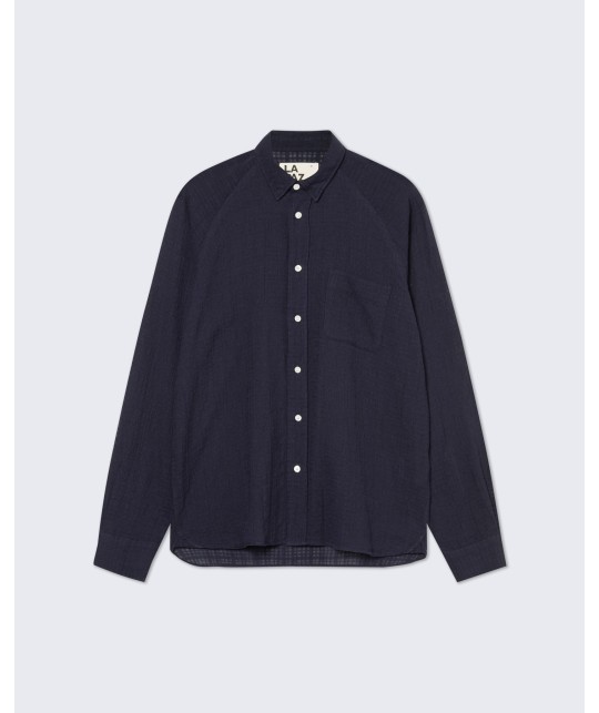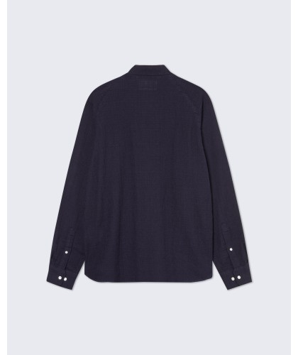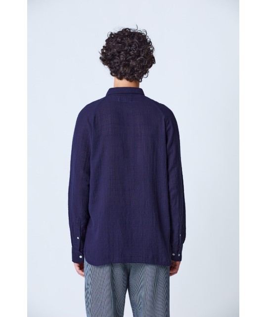 Chemise manches raglan en coton ajouré bleu marine foncé. 1 poche poitrine. Boutons en nacre