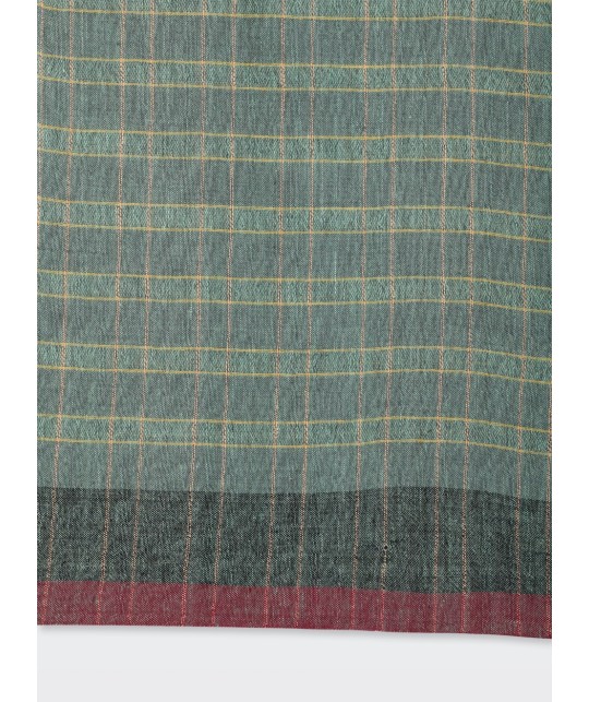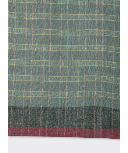 Ce tissu est confectionné par les artisanes de Women Weave, une association caritative basée à Maheshwar, dans l'État du Madhya Pradesh, qui œuvre depuis 2002 à l'autonomisation des femmes grâce au tissage artisanal durable. Les fils teints sont tissés à la main pour former un motif à carreaux, rehaussé de motifs réalisés selon la technique de la trame supplémentaire — une méthode de tissage minutieuse et discontinue où des fils plus épais sont incrustés à la main dans la chaîne. Les légères variations et imperfections reflètent l'authenticité et la touche humaine de cet artisanat traditionnel.