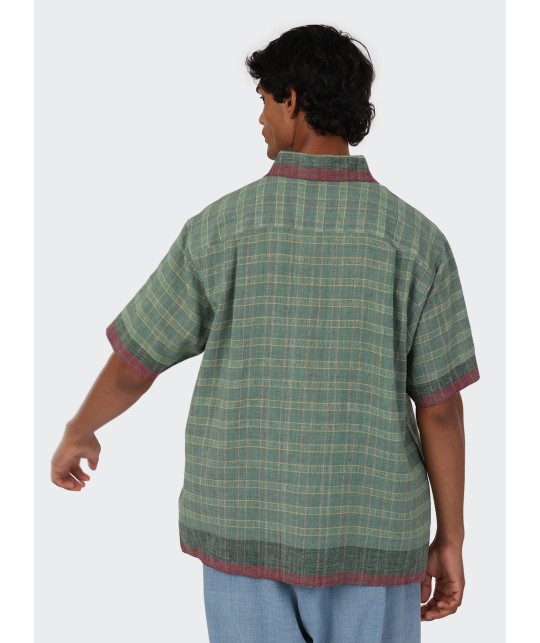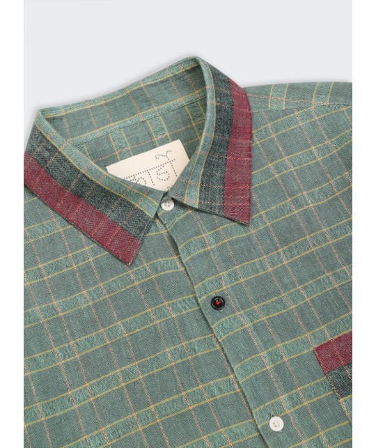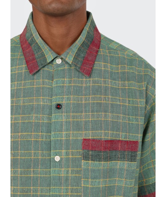 Chemise coupe oversize en coton tissé main, verte à carreaux, détails selvedge. 1 poche, boutons en corozo.