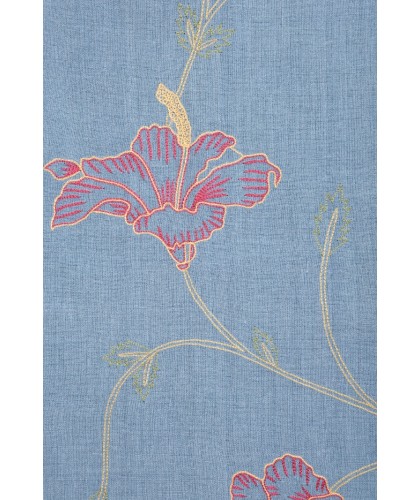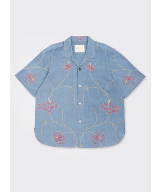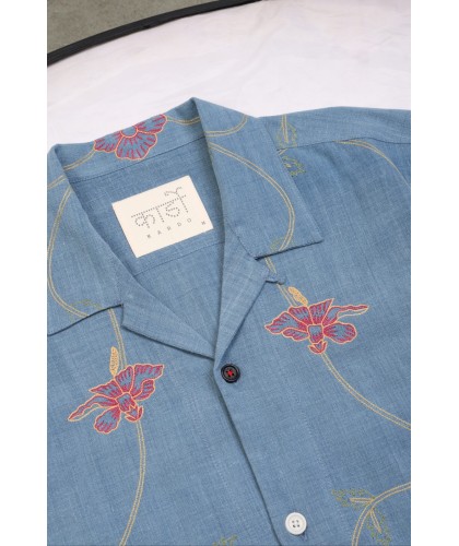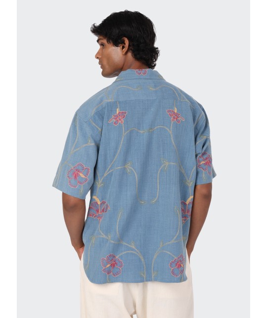 Chemise en coton khadi, teinture indigo naturelle, motif floral brodé main. Coupe oversize, col ouvert. 100% coton bio, vegan, fabriquée en Inde.