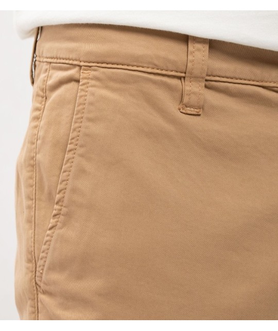 Chino slim 4 poches en coton bio beige. Fermeture éclair, poches arrières passepoilées.