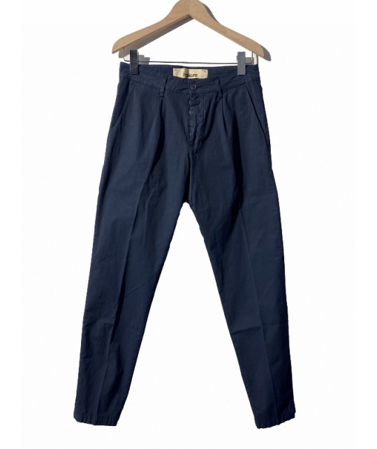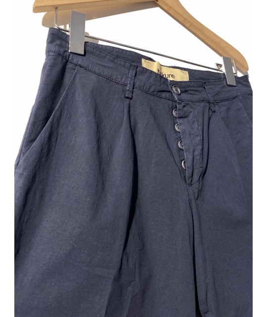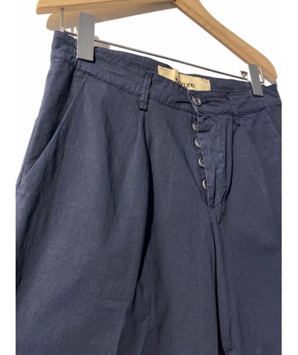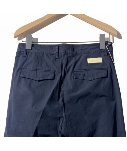 Pantalon cropped en gabardine très légère bleu marine, coupe carotte, 1 pince, 2 poches arrières à rabats, braguette à boutons. 100% coton, fabriqué en Italie.