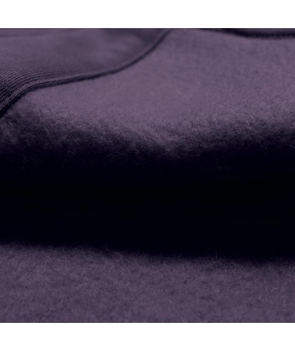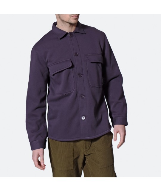 Surchemise en molleton violet, 5 boutons, 2 grandes poches poitrine à rabat et bouton caché, poignets boutonnés. 80% coton BCI 20% polyester, boutons en corozo. Vegan.