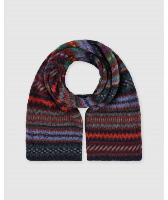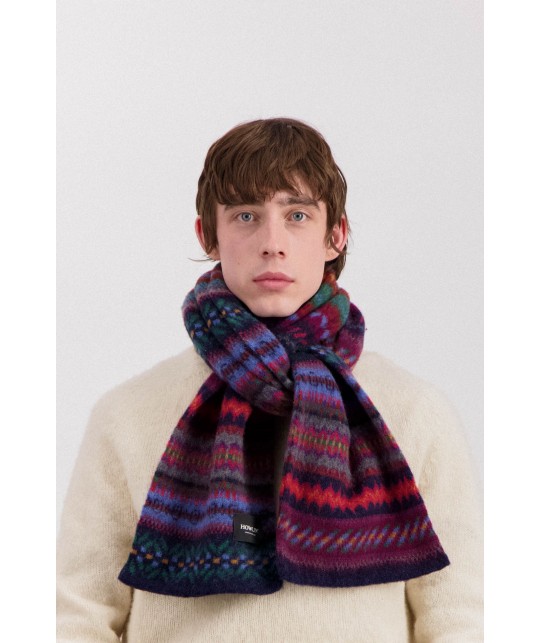 Echarpe en laine vierge peignée à motifs multicolores.
