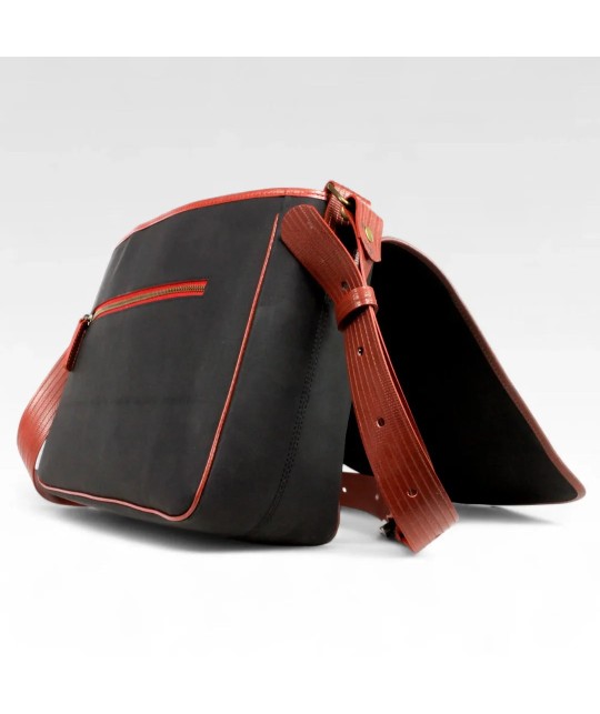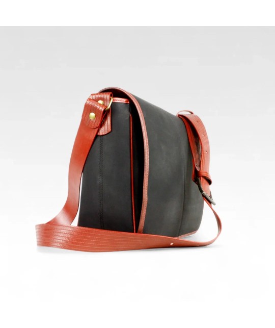 Besace en blanchet (caoutchouc utilisé dans l'imprimerie) et lance à incendie upcyclés.