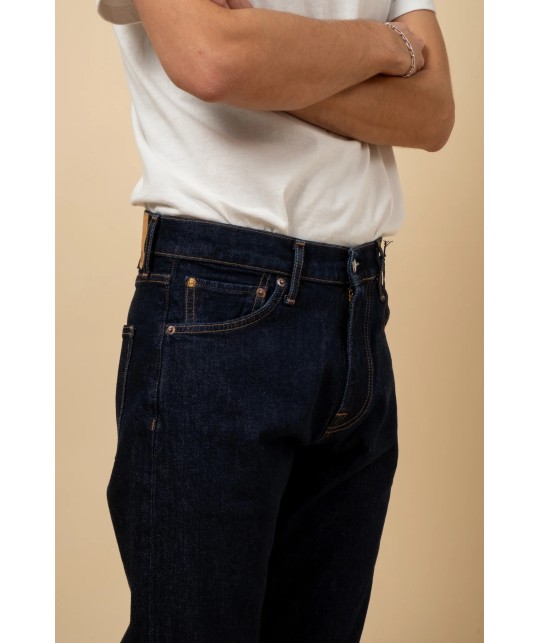 Jean coupe droite en denim bio brut rinsed. Coupe M8.